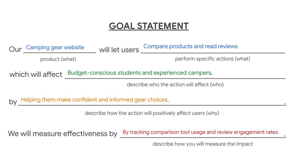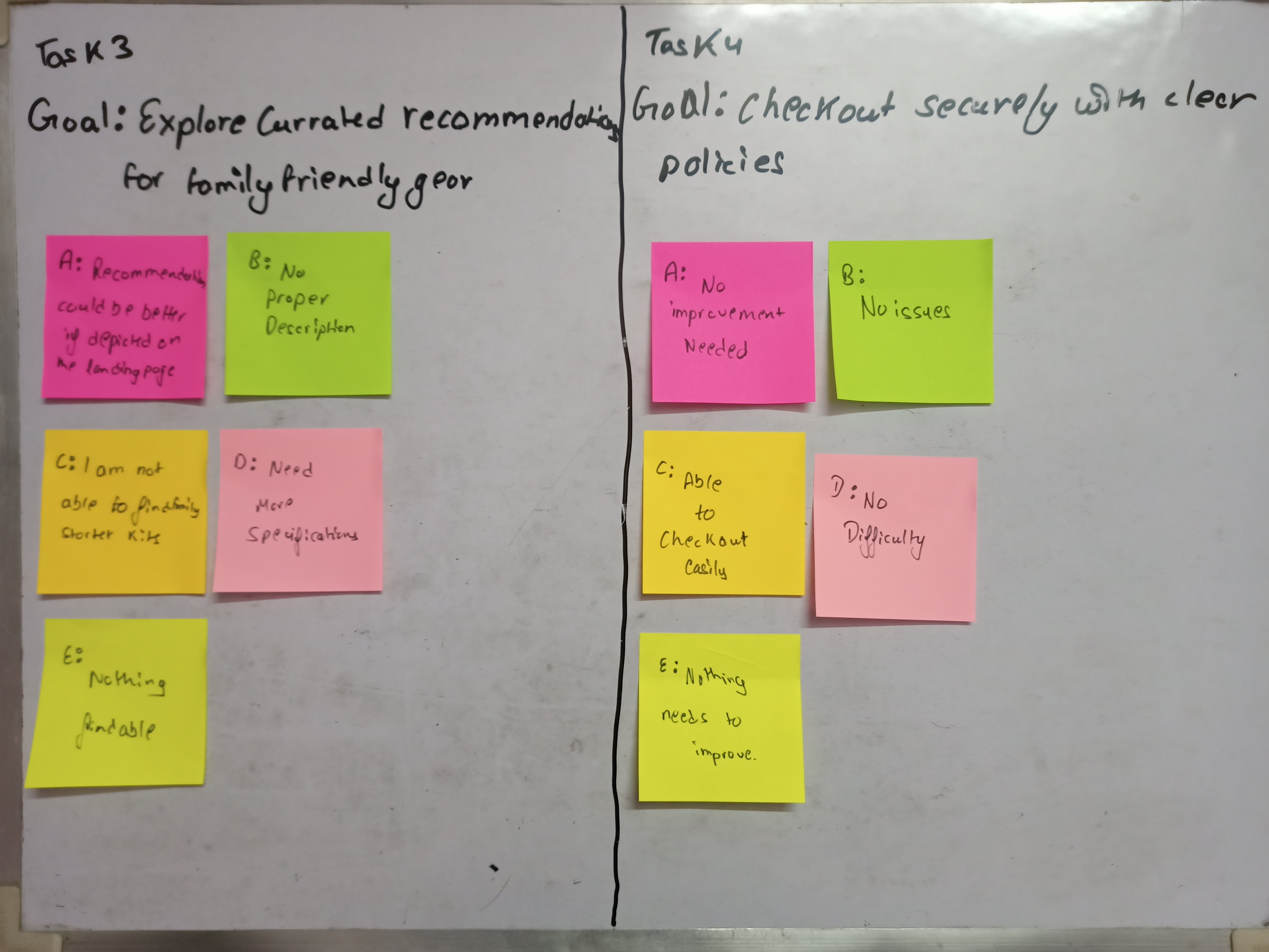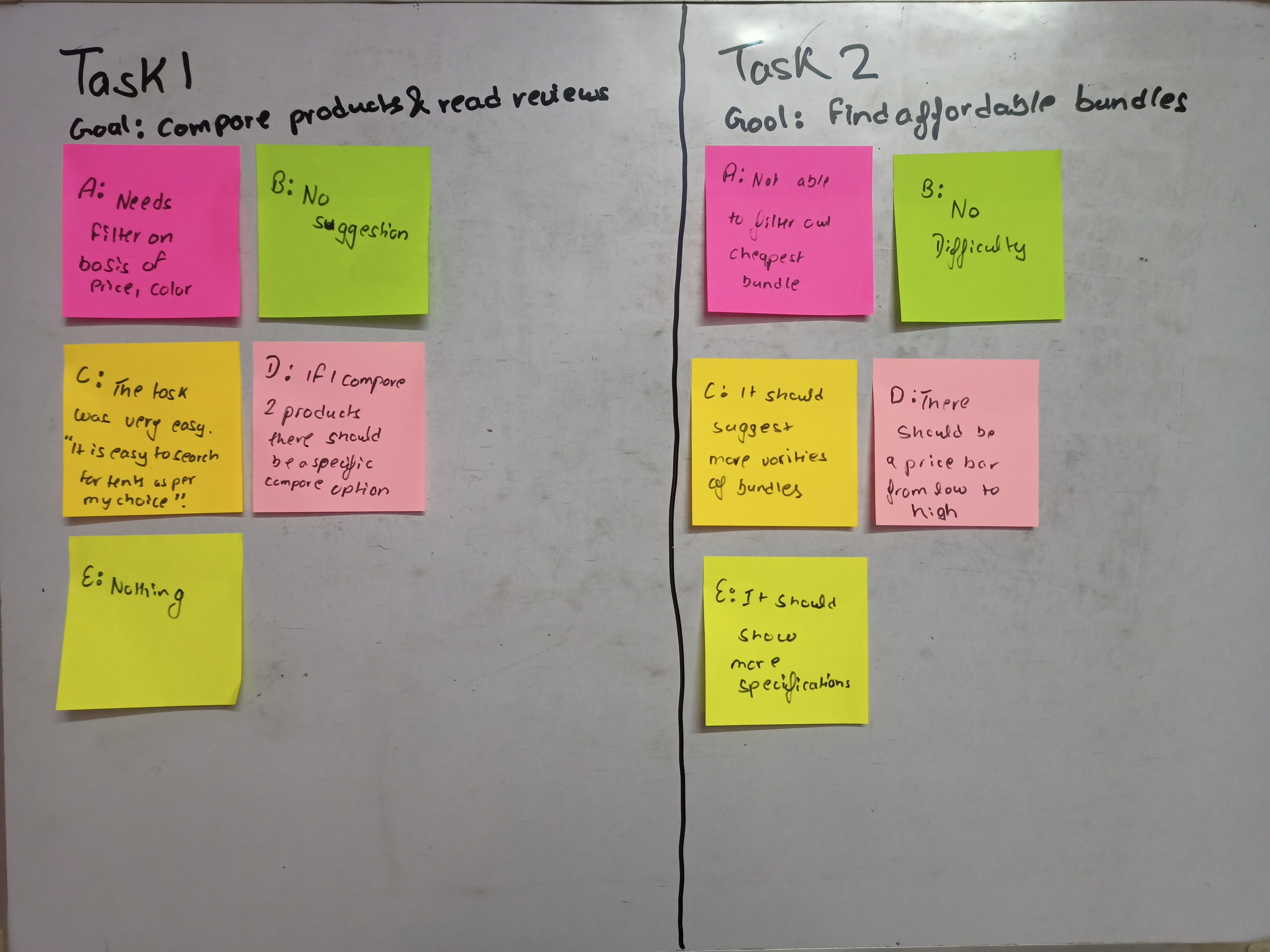 During the study, participants were asked to complete key tasks, such as comparing two specific gear items, locating a budget-friendly family bundle, and completing the checkout process. Throughout the sessions, qualitative data was collected, including observations, direct quotes, and immediate feedback, which was then synthesized.