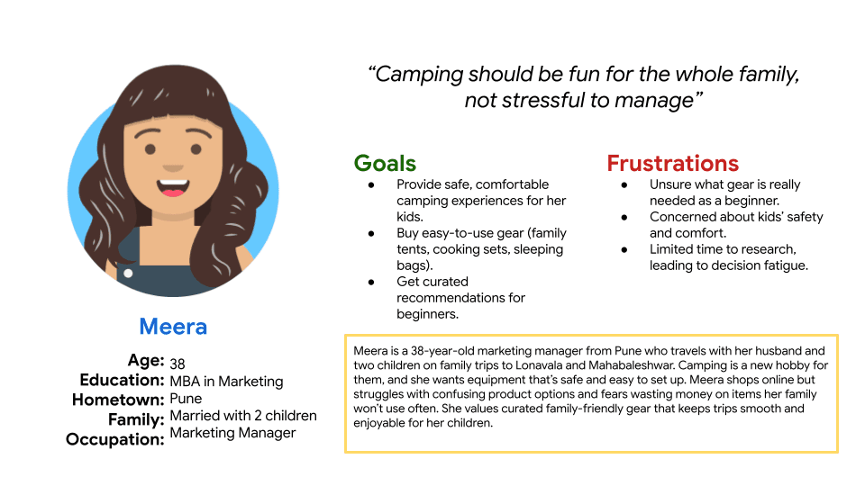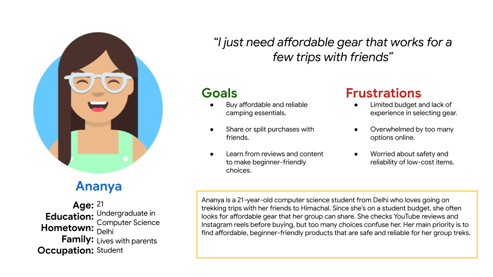 The research established the foundation for three detailed User Personas: Raghav (Experienced Camper), Ananya (Budget-Conscious Student), and Meera (Family-Oriented Beginner). Each persona represents a crucial audience segment, ensuring solutions address their unique needs for durability, affordability, and curation, respectively.