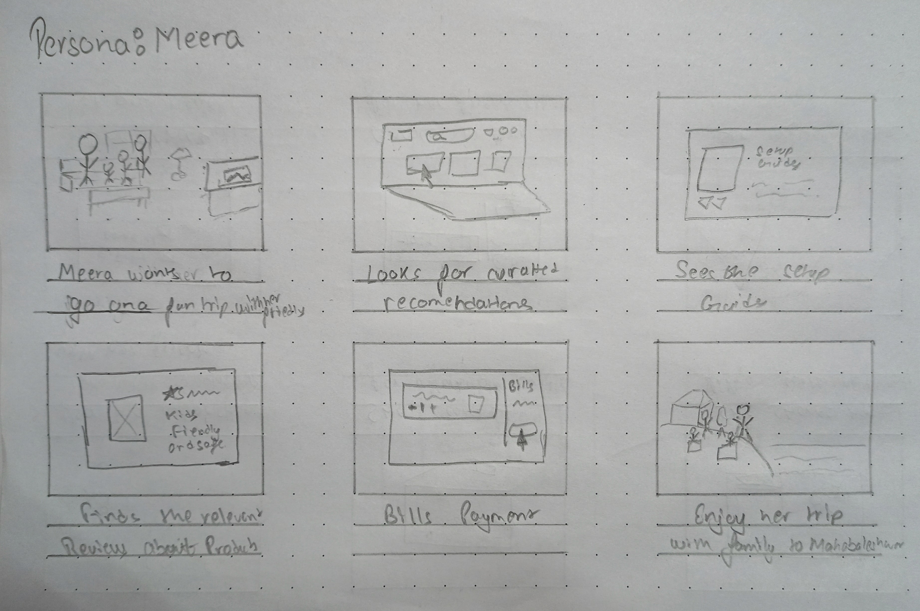 To visualize how the new platform would meet the user needs identified in the Define phase, Storyboards were created. Storyboards help communicate a user's emotional journey and the context of use, clearly illustrating how Basecamp's features—such as quick comparison tools or curated family bundles—would relieve specific pain points.