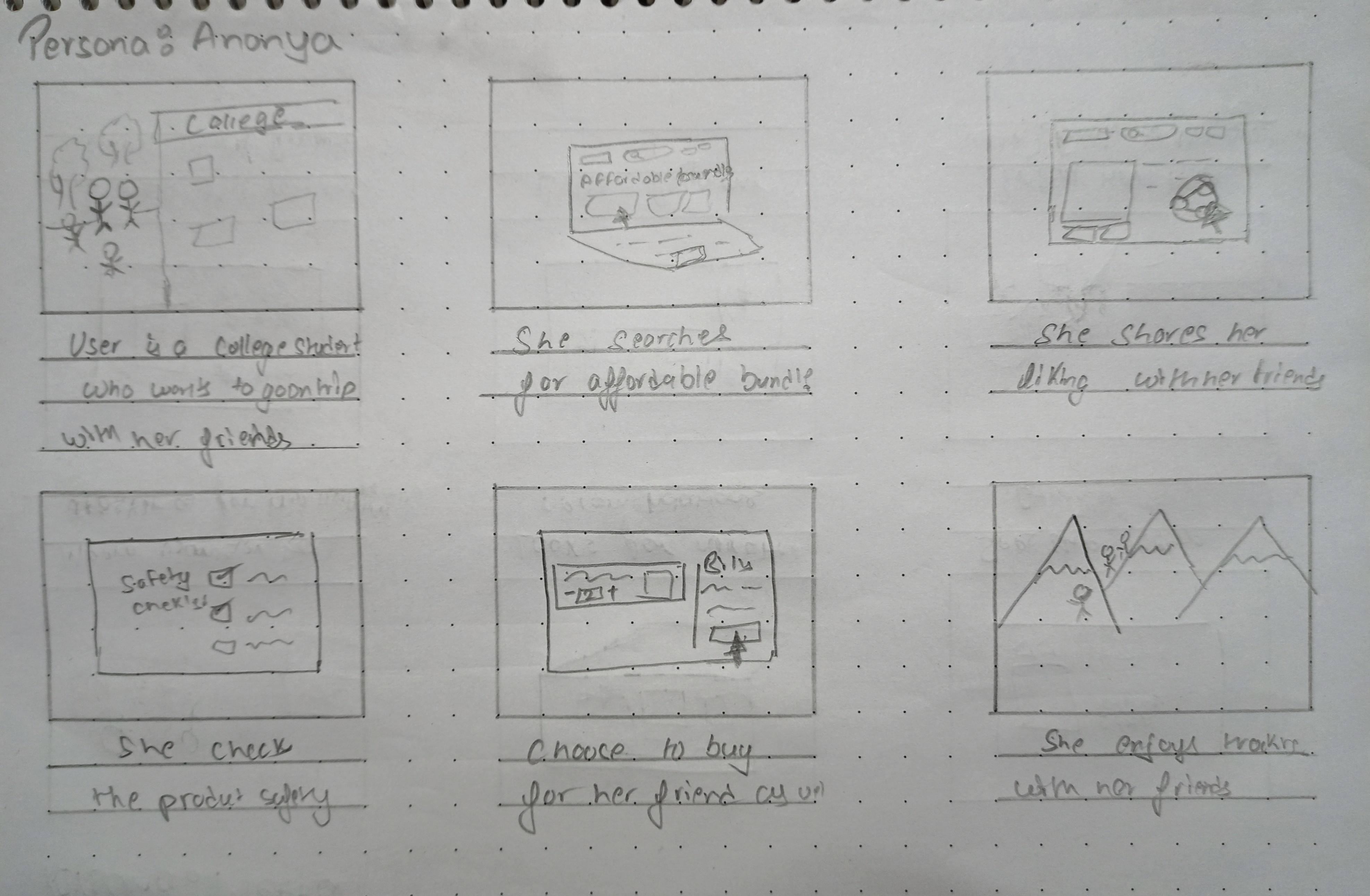 A storyboard sequence illustrating a persona (e.g., Meera) successfully finding, comparing, and confidently purchasing a family-friendly gear bundle on Basecamp.