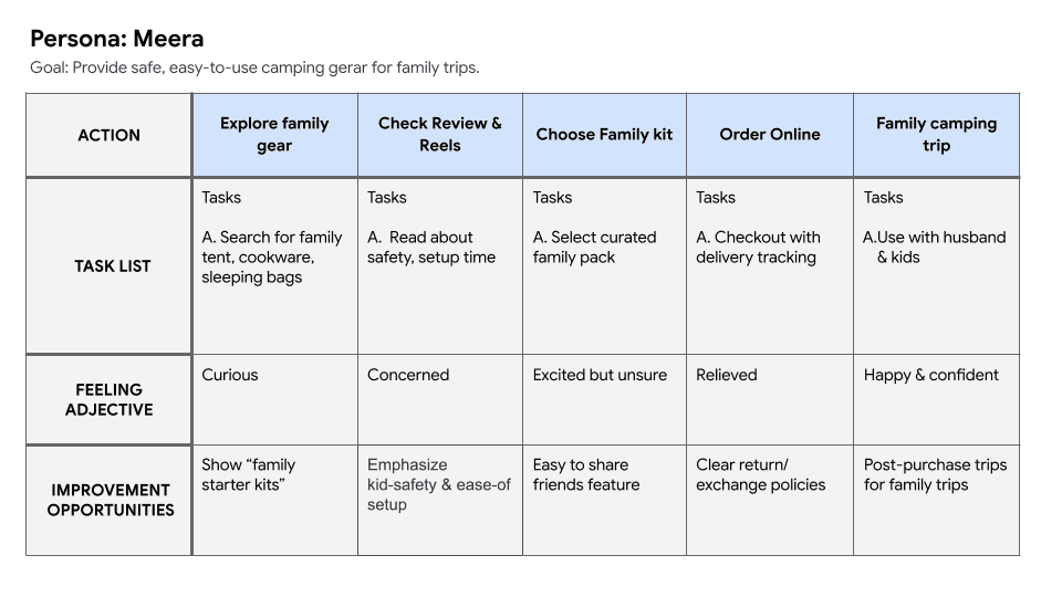 We believe that creating a prominent "Family Gear" section with curated recommendations for parents like Meera will lead to higher family kit sales because it alleviates their anxiety about choosing safe, appropriate gear for children.