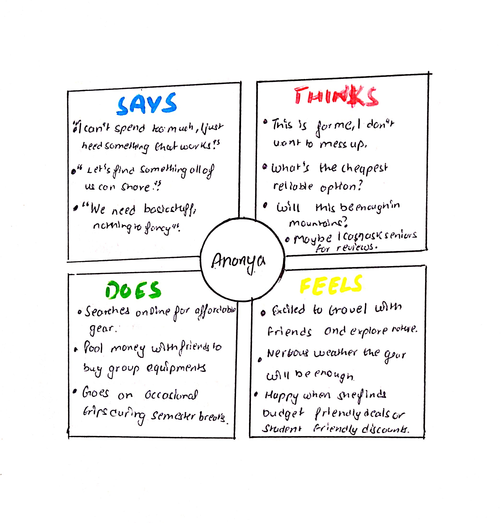 We began by creating Empathy Maps for our core user types. This exercise synthesized our initial observations, illuminating their specific thoughts, feelings, and actions related to online gear shopping. Moving beyond assumptions, this step helped ground the design in user reality.