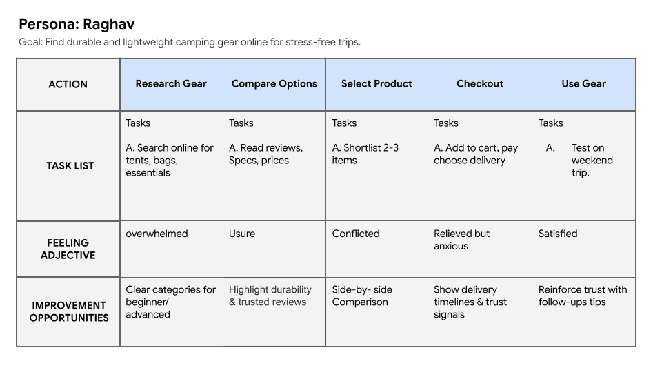 Finally, User Journey Maps were created to visualize the complete, end-to-end experience of each persona attempting to achieve their goals on a typical camping gear website. These maps were instrumental in identifying specific moments of friction and key opportunities for design intervention—for instance, high frustration during the detailed product review phase and anxiety during the final, often unclear, checkout process.