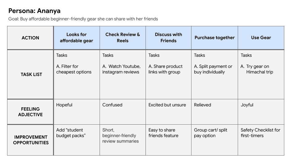 Affordability & Curation (Learned from Decathlon): Decathlon's success with affordability and strong content validates the need for Basecamp to clearly feature budget-friendly bundles for users like Ananya.