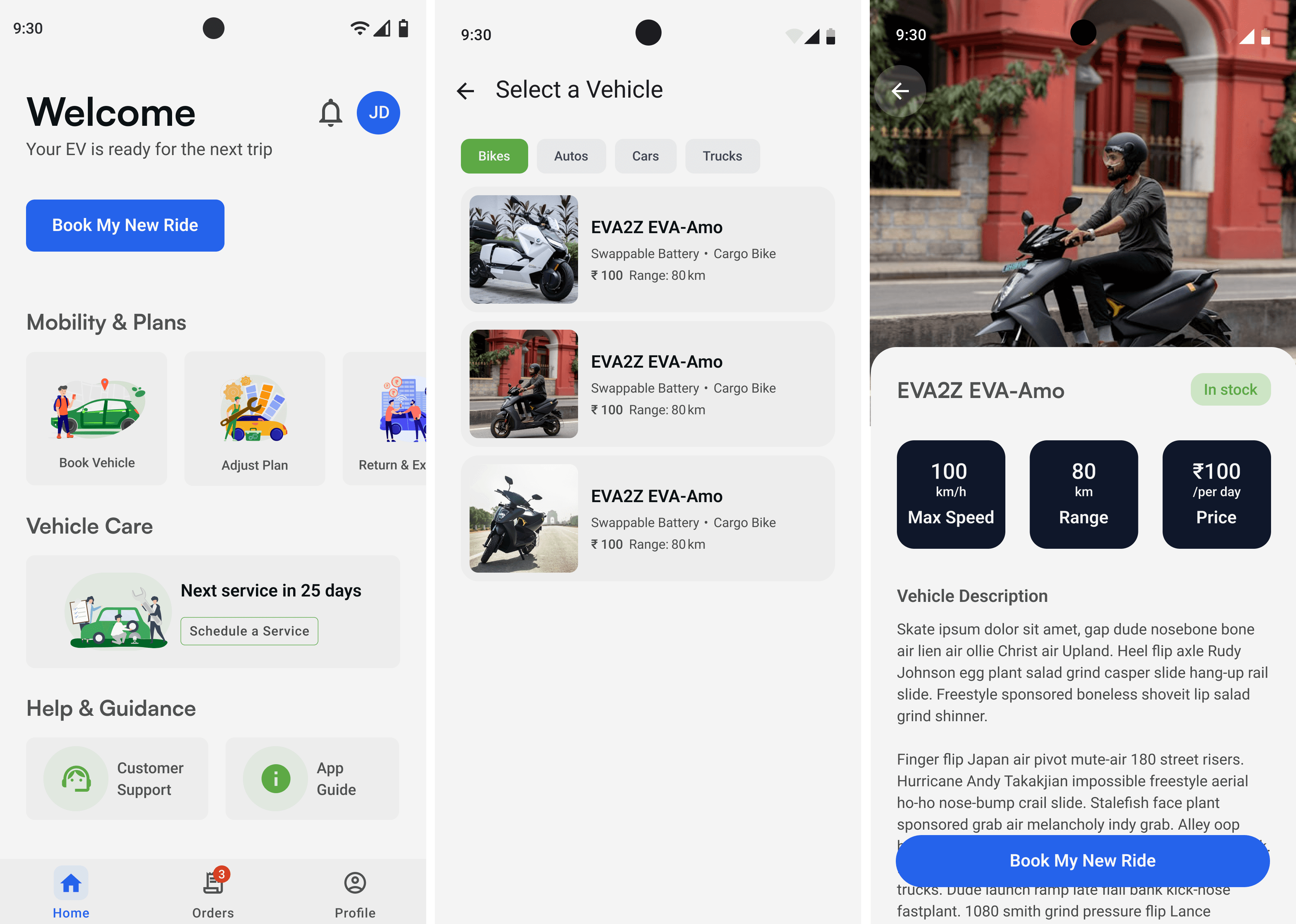 Clear entry point with a prominent “Book My New Ride” CTA. Tasks are categorized into logical groups — Mobility & Plans, Vehicle Care, Help & Guidance — supported by a structured navigation bar. Vehicle selection now includes assist chips for quick filtering and visual clarity.